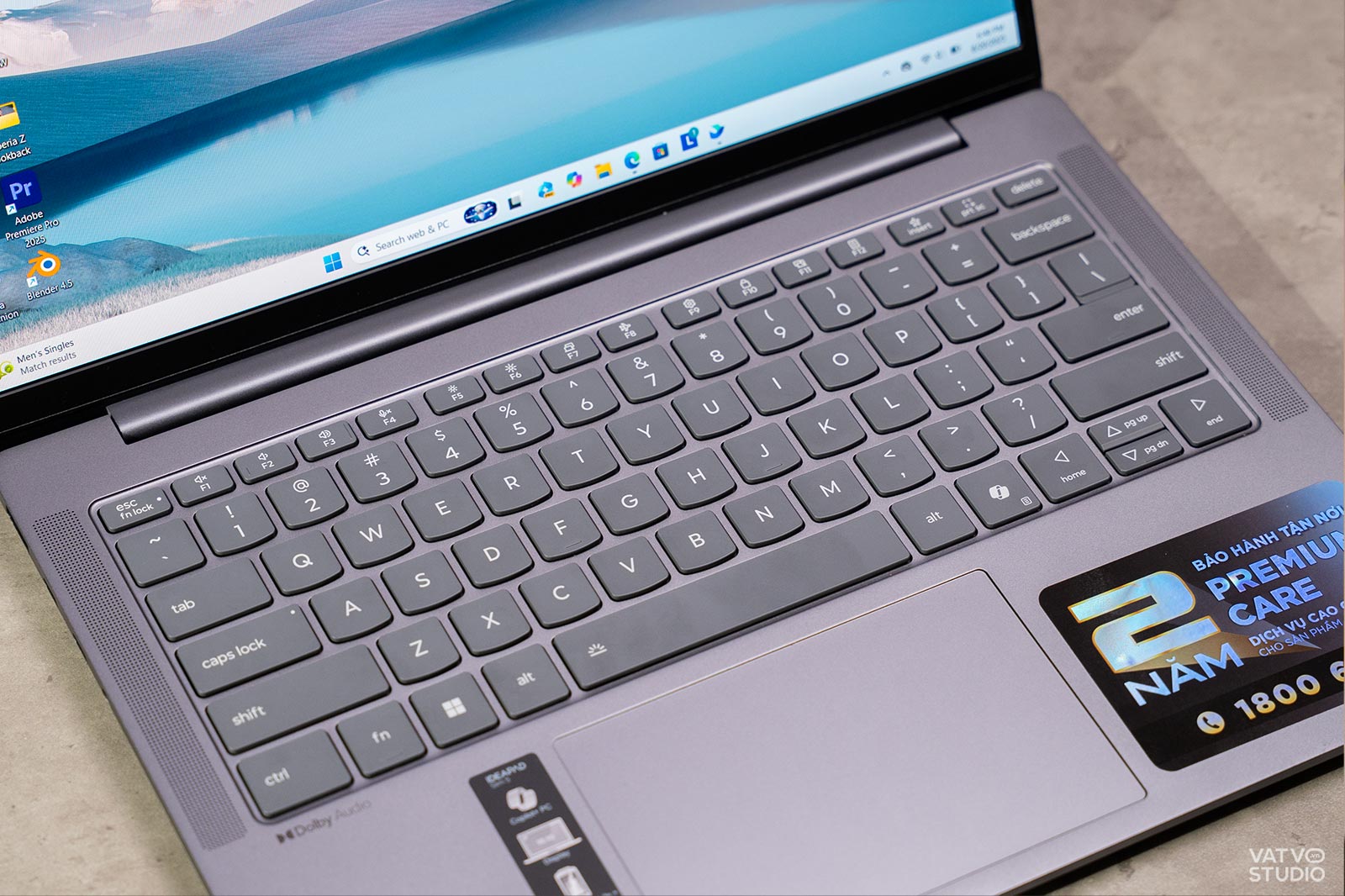Các mẫu laptop của Lenovo luôn làm rất tốt về trải nghiệm gõ phím, và Lenovo IdeaPad Slim 5 OLED cũng không phải ngoại lệ. Dù có thiết kế phím hơi lạ mắt, cảm giác gõ thực tế lại cực kỳ thoải mái. Hành trình phím mà mẫu laptop cho ra khá hợp lý, độ nảy tốt và phản hồi nhanh chóng giúp việc gõ văn bản trong thời gian dài không bị mỏi tay. Bàn phím cũng được trang bị đèn nền, hỗ trợ tốt cho việc sử dụng trong môi trường thiếu sáng.