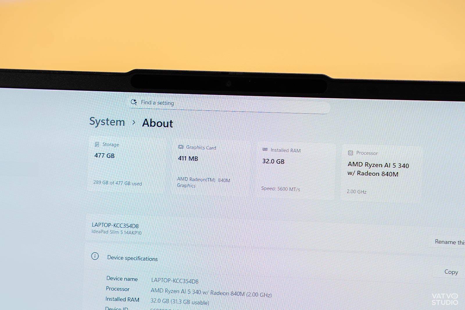 Lenovo IdeaPad Slim 5 OLED được trang bị một cấu hình khá mạnh nếu xét đến các tác vụ văn phòng. Máy sử dụng vi xử lý AMD Ryzen AI 5 340, một con chip thuộc kiến trúc Zen 5 mới đến từ AMD. Ngoài ra, thiết bị cũng đi kèm card đồ họa tích hợp AMD Radeon 840M cùng dung lượng RAM cực lớn lên đến 32GB và SSD 512GB.