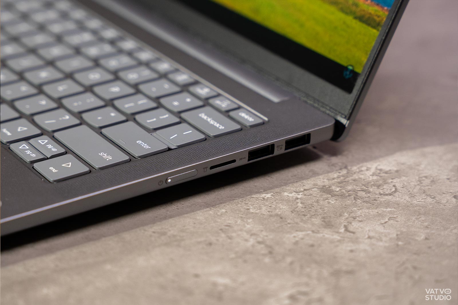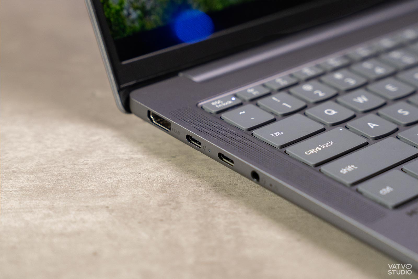 Một điểm cộng lớn khác trên Lenovo IdeaPad Slim 5 OLED đến từ cổng kết nối. Máy trang bị hệ thống cổng kết nối đầy đủ, bao gồm 2 cổng USB-A, 1 cổng HDMI, 1 đầu đọc thẻ SD, 1 jack cắm 3.5mm và 2 cổng USB-C hỗ trợ cả sạc Power Delivery kiêm xuất hình DisplayPort.