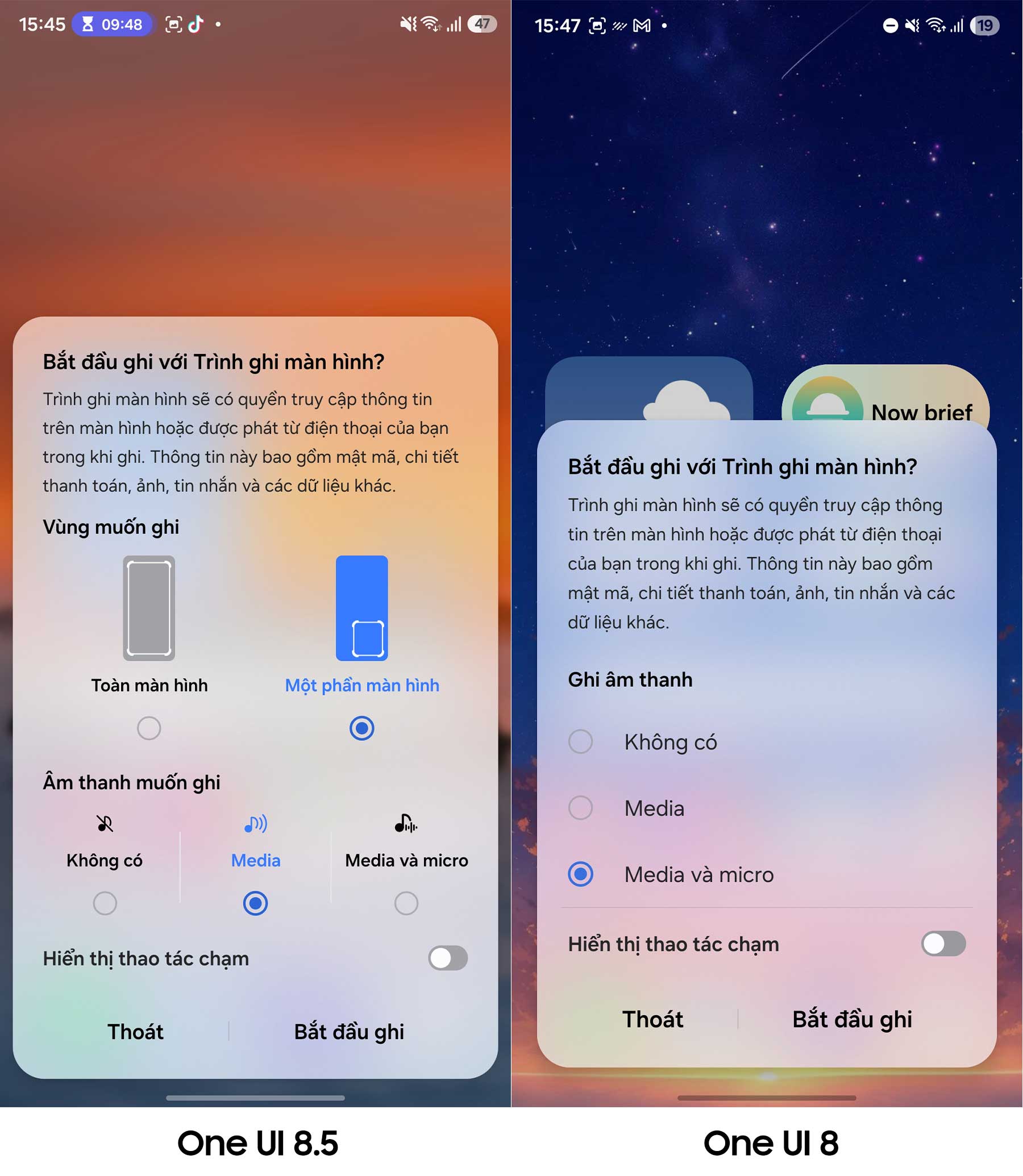 Trình ghi màn hình (Screen Recorder) cũng được nâng cấp với khả năng Ghi một phần màn hình. Thay vì phải ghi lại toàn bộ màn hình và để lộ các thông báo hay thanh trạng thái nhạy cảm, giờ đây bạn có thể khoanh vùng khu vực cần quay. Tính năng này rất giống với công cụ Snipping Tool trên Windows, cực kỳ hữu ích khi bạn muốn làm hướng dẫn sử dụng nhanh.