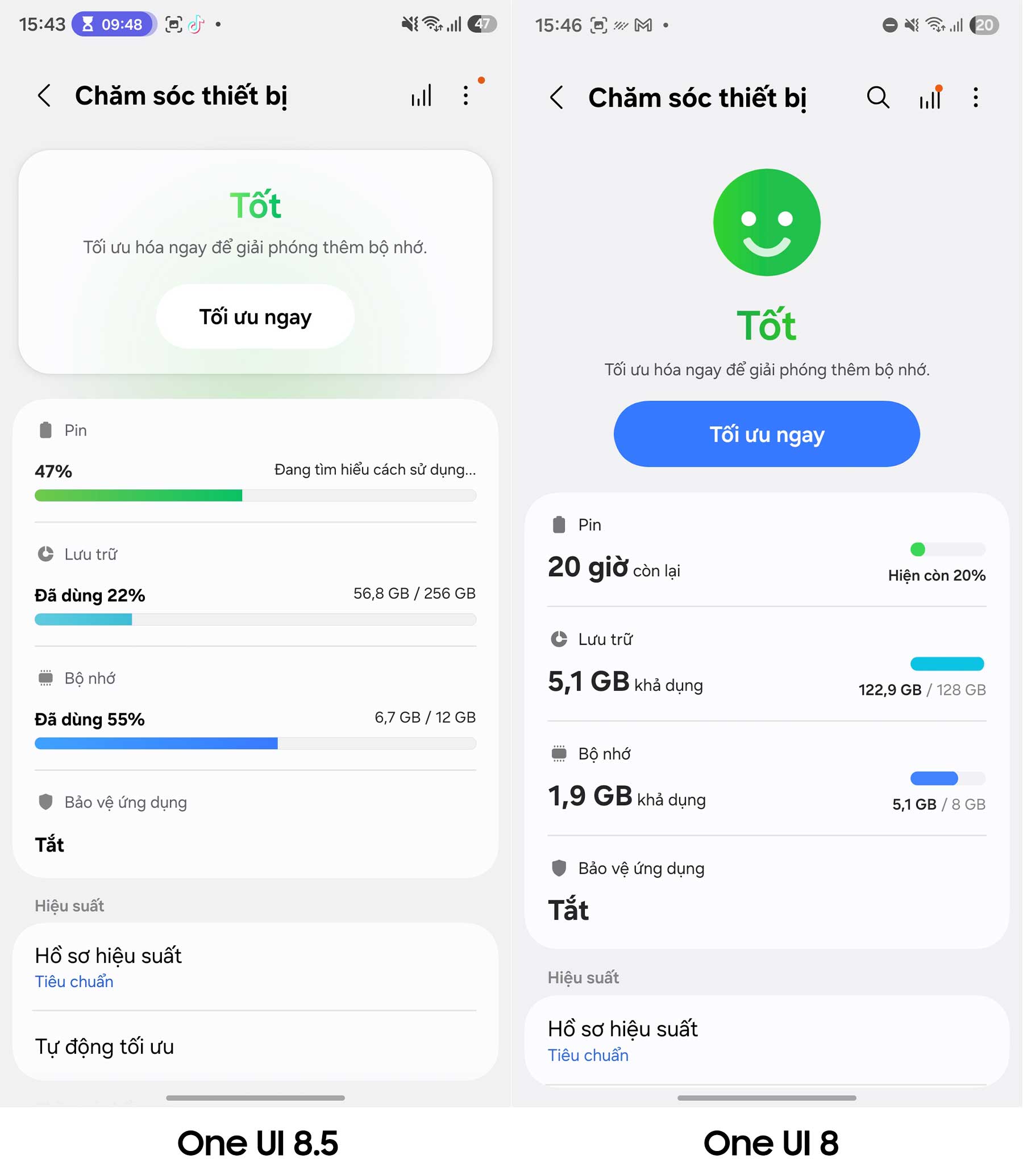 Cuối cùng, giao diện Chăm sóc thiết bị (Device Care) cũng có sự thay đổi về giao diện. Các biểu đồ tiêu thụ pin được vẽ lại to rõ hơn. Samsung cung cấp thêm tùy chọn tắt biểu tượng viên pin trên thanh trạng thái, chỉ giữ lại con số phần trăm. Điều này dành riêng cho những người dùng theo chủ nghĩa tối giản.