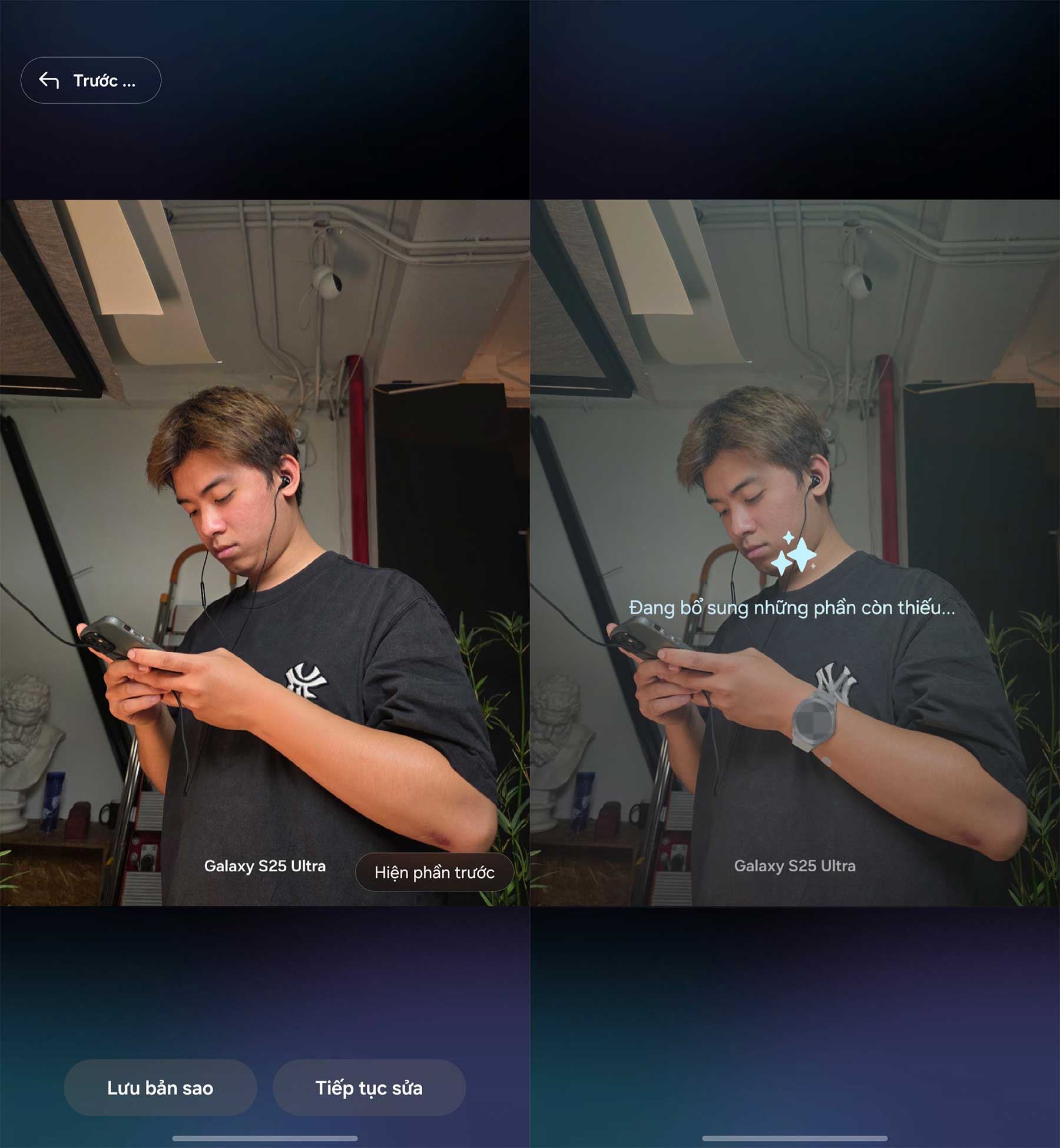 Về Galaxy AI, One UI 8.5 Beta tiếp tục hoàn thiện khả năng chỉnh sửa ảnh. Tính năng Xóa vật thể (Object Eraser) giờ đây cho phép chỉnh sửa liên tục. Bạn có thể xóa một người, sau đó tiếp tục xóa thêm một cái cây, rồi di chuyển một vật thể khác mà không cần phải lưu ảnh sau mỗi lần thao tác. Lịch sử chỉnh sửa cũng được lưu lại chi tiết, cho phép bạn hoàn tác từng bước một cách dễ dàng.