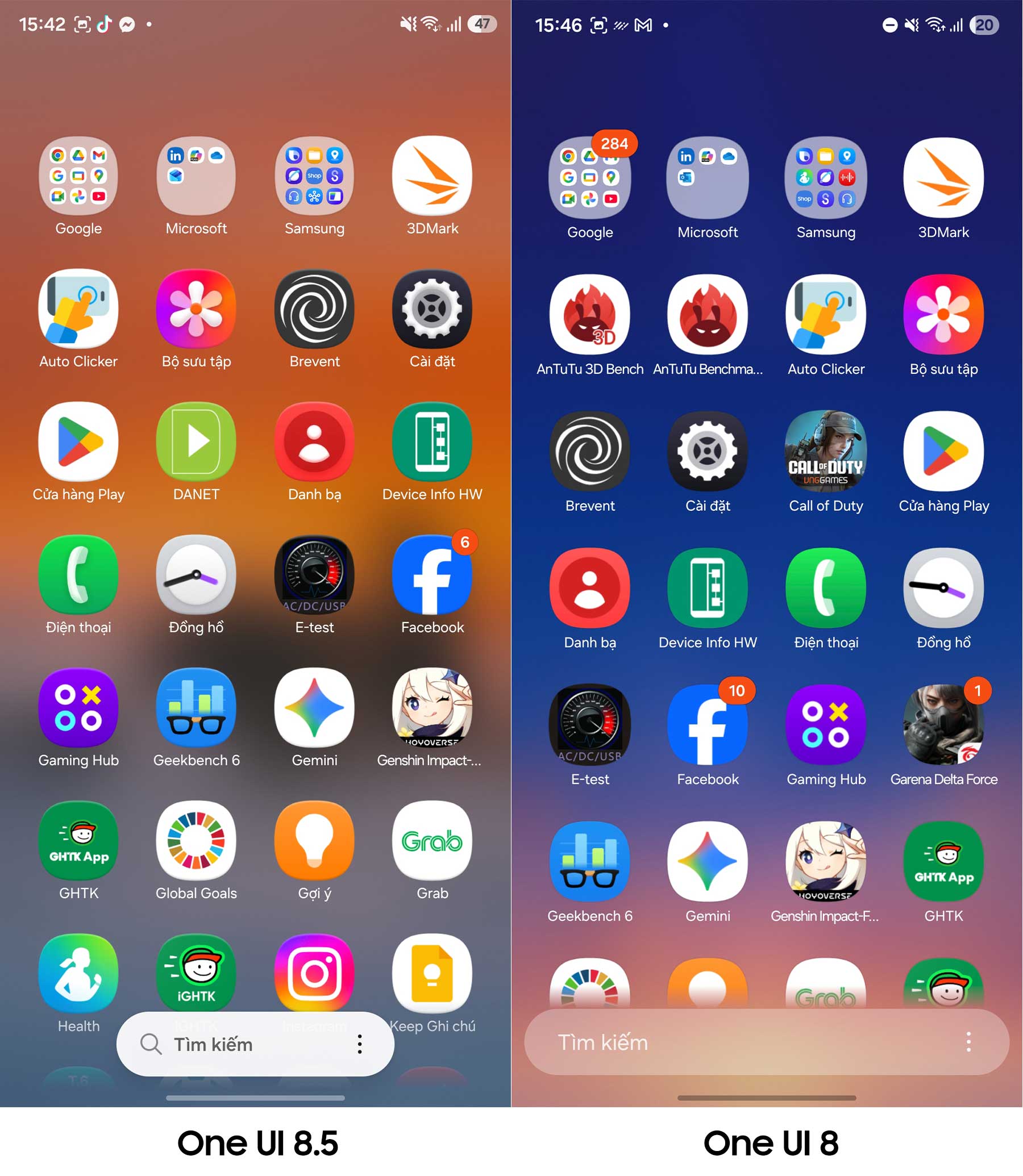 Sâu bên trong, One UI 8.5 Beta mang đến ngôn ngữ thiết kế hiện đại và nổi khối hơn. Điểm thay đổi đầu tiên nằm ở thanh tìm kiếm (Search Bar) trong ngăn ứng dụng. Trên One UI 8, thanh này thường kéo dài hết chiều ngang màn hình, tạo cảm giác hơi thô và chiếm diện tích.