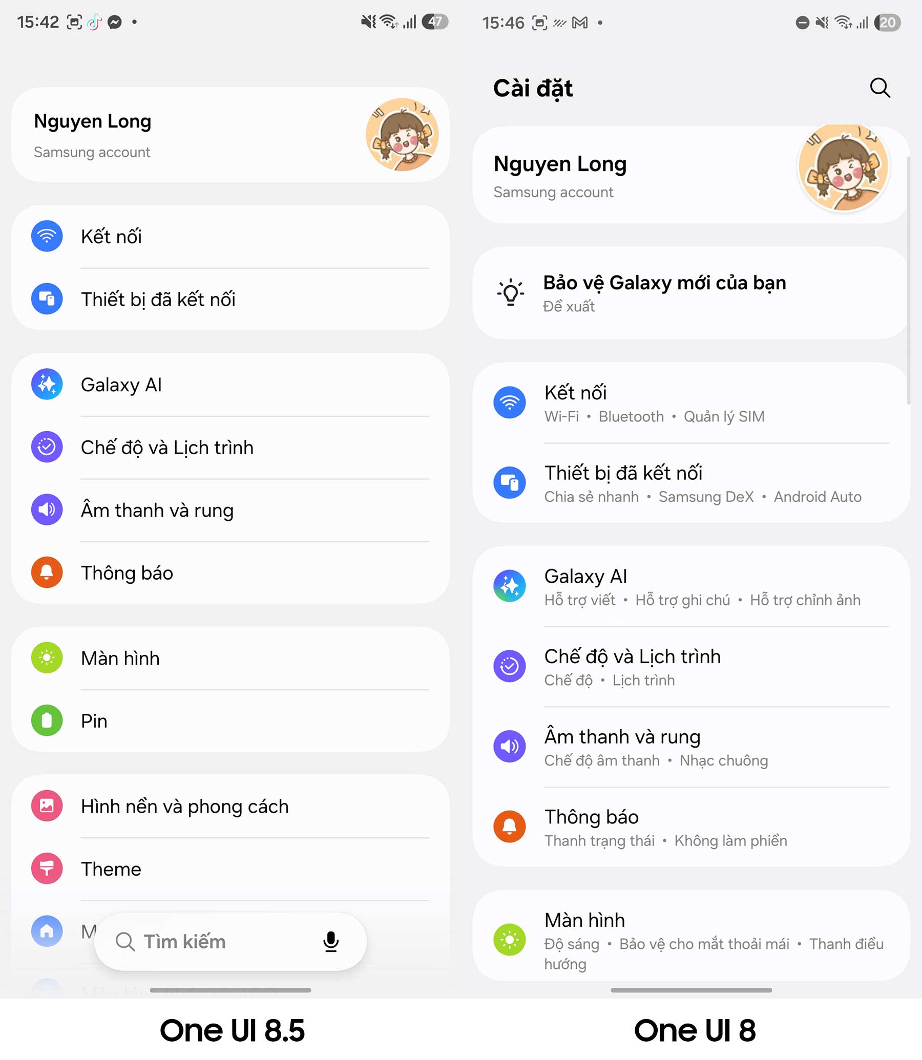 Ứng dụng Cài đặt (Settings) cũng có sự thay đổi lớn về giao diện. Trên Galaxy S25 FE, dưới mỗi mục chính như “Kết nối” hay “Màn hình” thường có một dòng mô tả nhỏ liệt kê các tính năng bên trong. Còn trên One UI 8.5 Beta, Samsung đã lược bỏ hoàn toàn các dòng mô tả này. Giao diện Cài đặt giờ đây chỉ còn lại tên các mục chính và biểu tượng bên cạnh. Sự tối giản này giúp người dùng tập trung nhanh vào nội dung cần tìm, đồng thời làm cho tổng thể giao diện trở nên sạch sẽ, gọn gàng hơn rất nhiều.