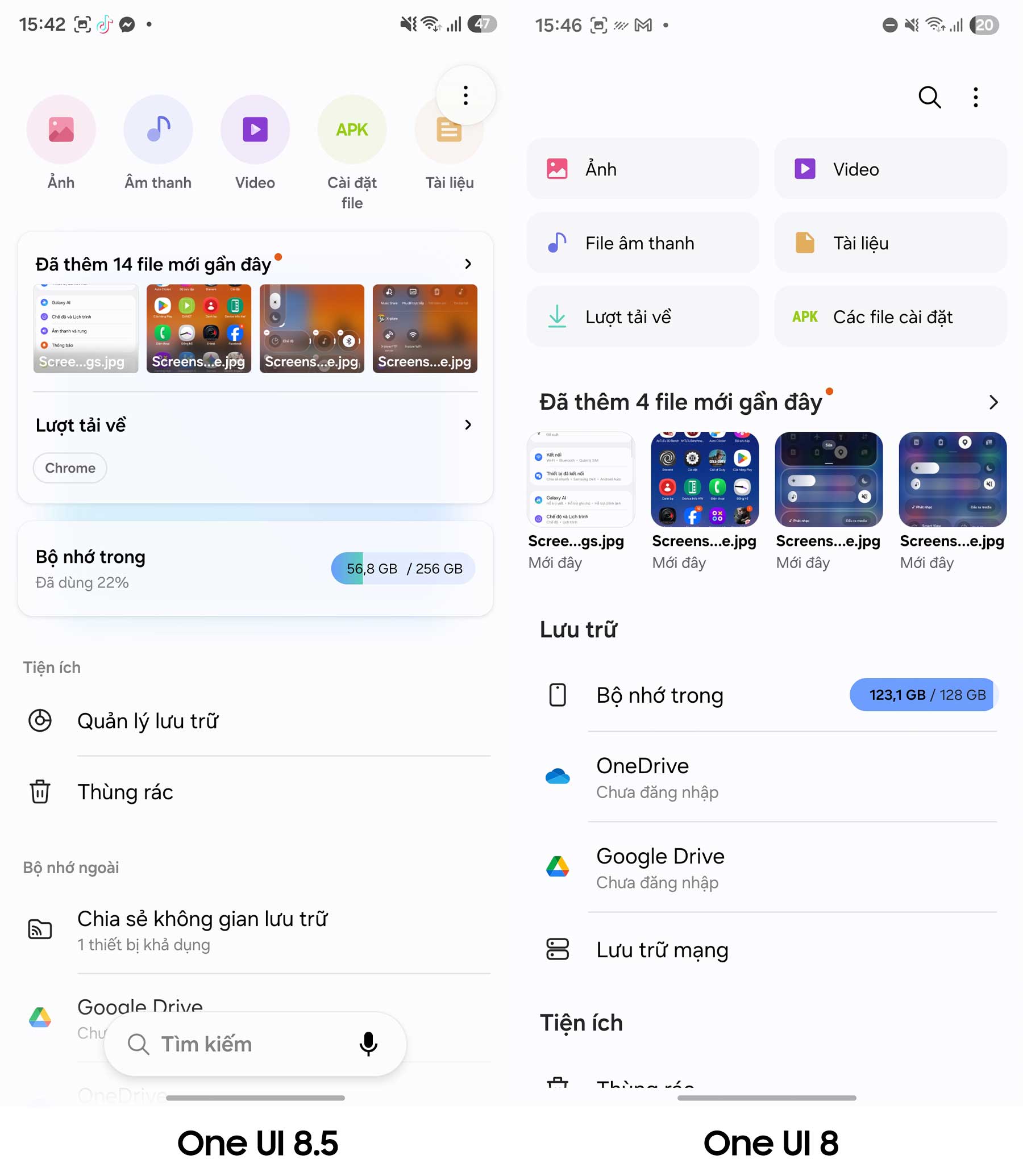 Ứng dụng File của bạn (My Files) cũng nhận được sự thay đổi lớn về cách sắp xếp. Trên phiên bản cũ, các danh mục như Ảnh, Video, Tài liệu được xếp theo danh sách dọc. Cách sắp xếp này tuy quen thuộc nhưng lại khiến người dùng phải cuộn trang nhiều nếu danh sách quá dài.