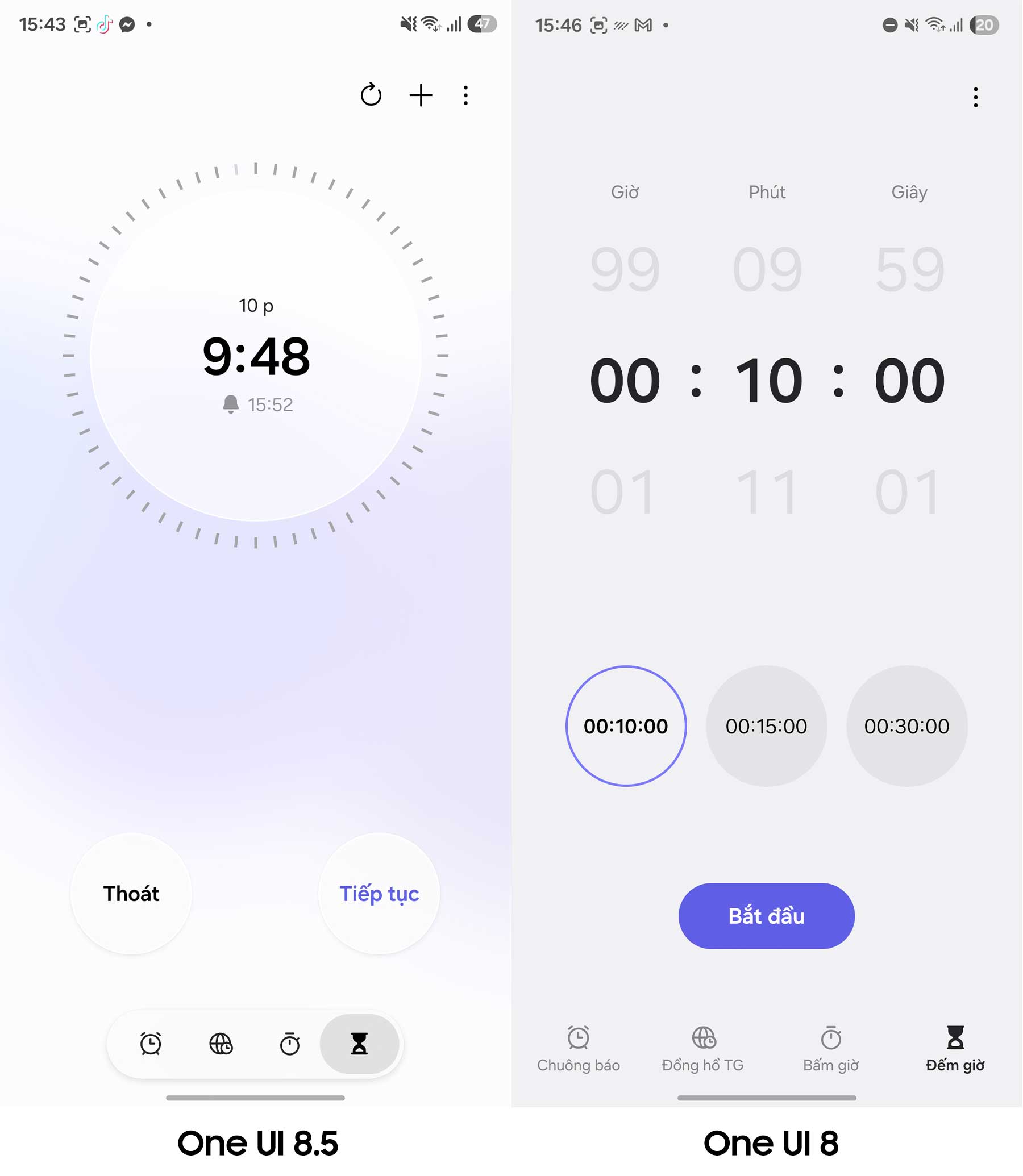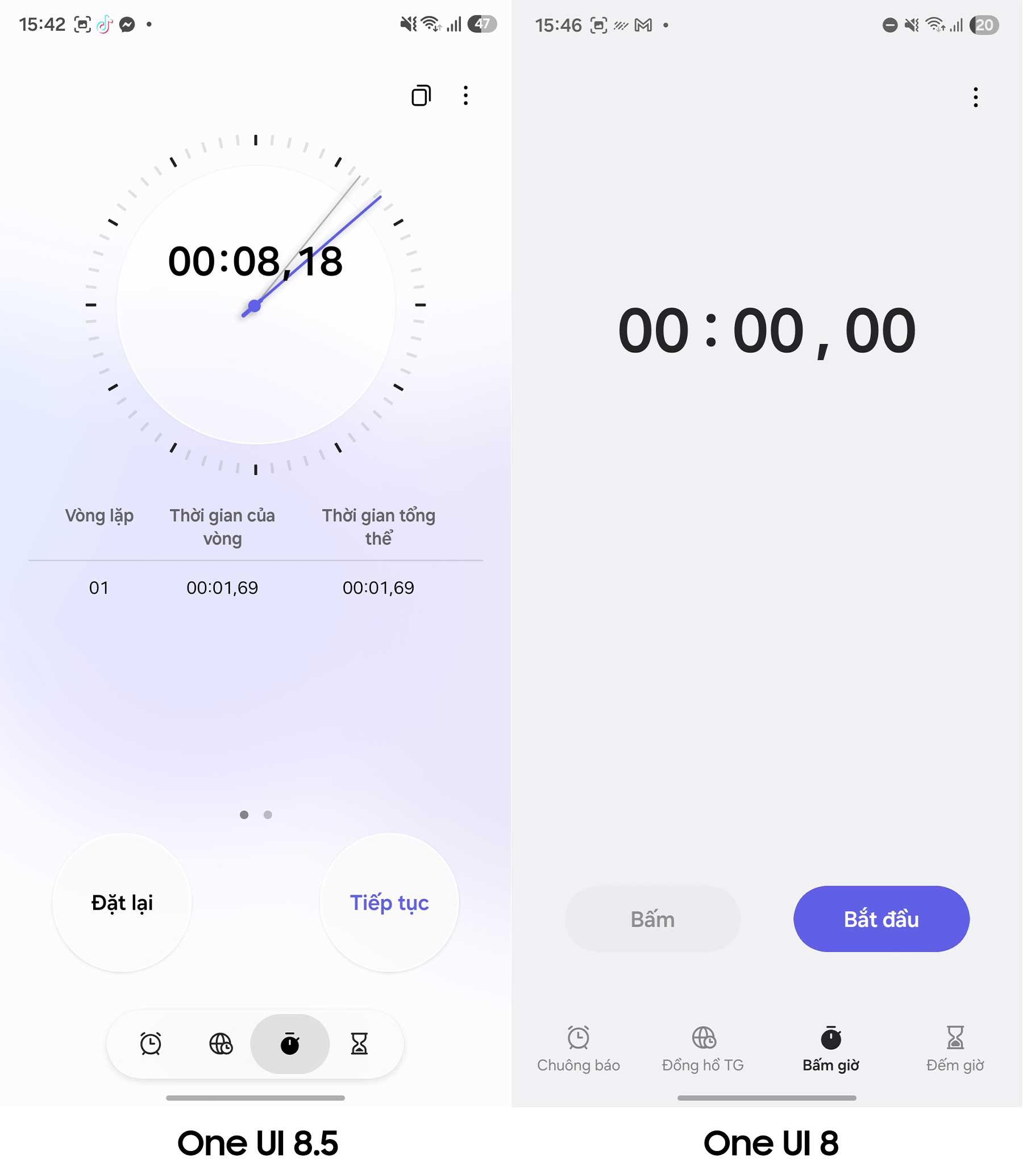Một nâng cấp cực kỳ thú vị khác nằm ở ứng dụng Đồng hồ (Clock). Samsung đã thiết kế lại giao diện đồng hồ bấm giờ và đồng hồ đếm ngược với các hiệu ứng thị giác đẹp mắt hơn. Các con số giờ đây có hiệu ứng ánh sáng nhẹ phía sau, tạo cảm giác cao cấp và bớt đơn điệu so với thiết kế phẳng của One UI 8.