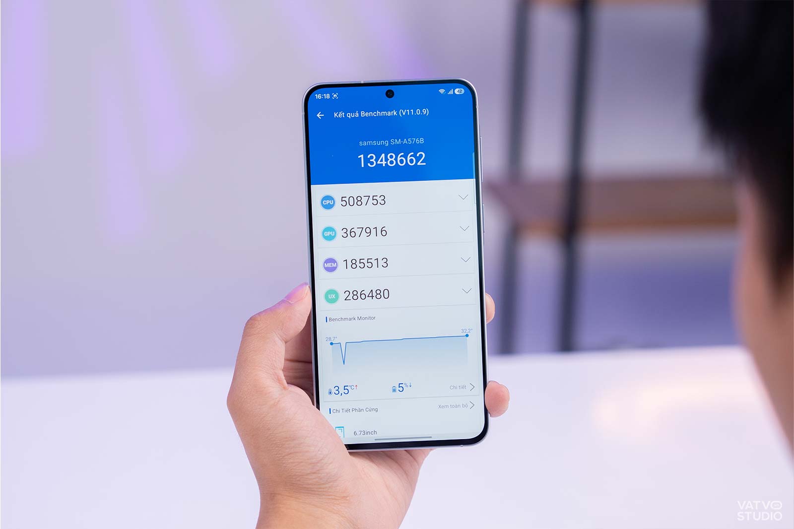 Thử nghiệm thực tế với phần mềm AnTuTu Benchmark, máy đạt 1,34 triệu điểm, một mức điểm tốt trong phân khúc. Với mức hiệu năng này, thiết bị xử lý mượt mà các tựa game phổ biến như LMHT: Tốc Chiến, PUBG Mobile hay Liên Quân Mobile ở thiết lập đồ họa cao. Ngay cả với những trò chơi nặng hơn như Genshin Impact, máy vẫn cho trải nghiệm ổn định nếu người dùng tinh chỉnh cấu hình hợp lý. Dung lượng RAM 8GB và bộ nhớ 128GB cũng đáp ứng tốt nhu cầu.