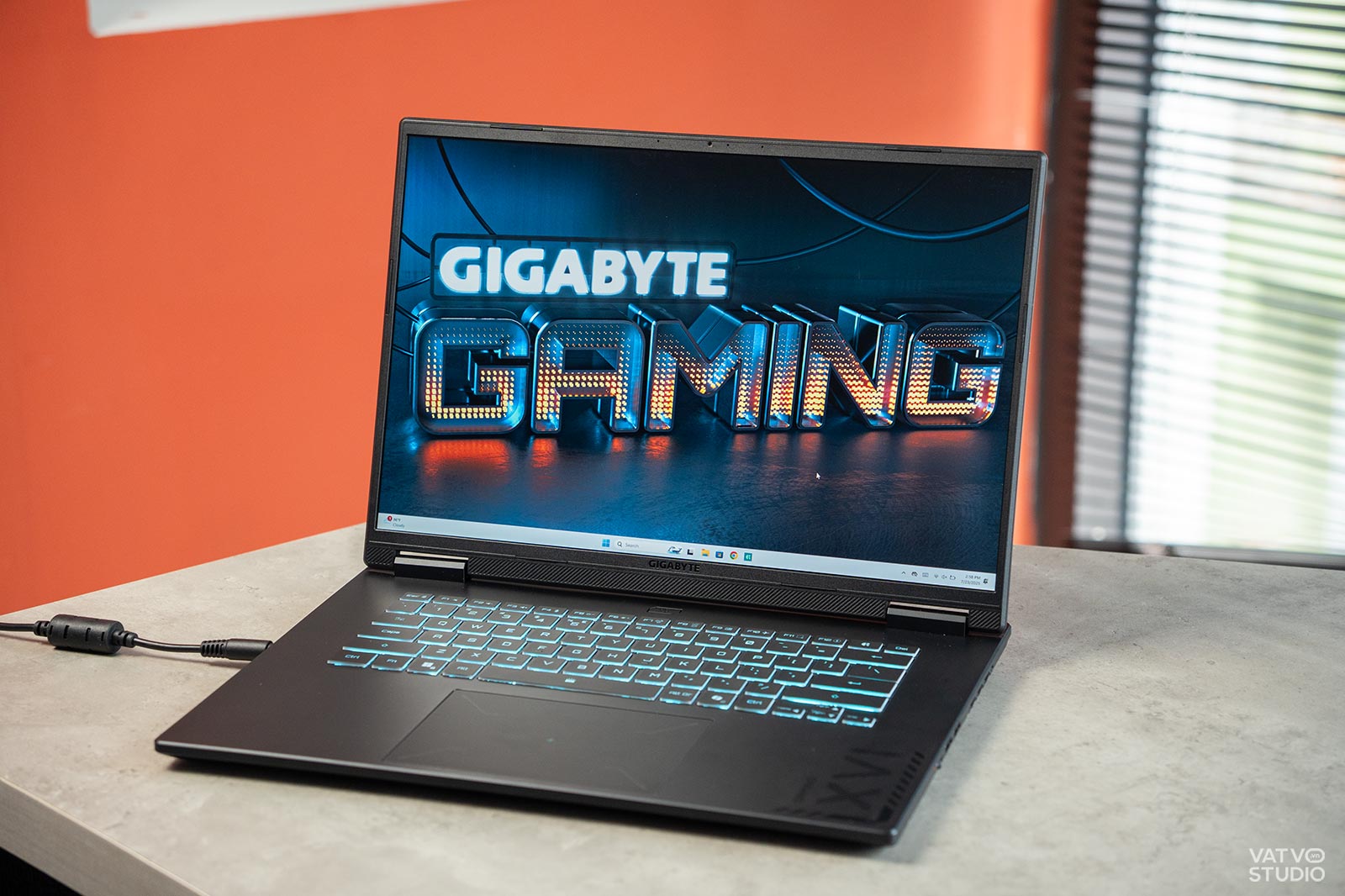 Logo Gigabyte không còn là dạng sơn thông thường mà là một chi tiết kim loại riêng biệt, có độ bóng và óng ánh nhẹ, góp phần tạo nên một vẻ ngoài cao cấp và lịch sự hơn hẳn. Dù toàn bộ thân máy vẫn được làm từ nhựa, bề mặt đã được phủ một lớp nhám nhẹ, mang lại cảm giác chạm rất giống kim loại và đặc biệt là không bám quá nhiều dấu vân tay.