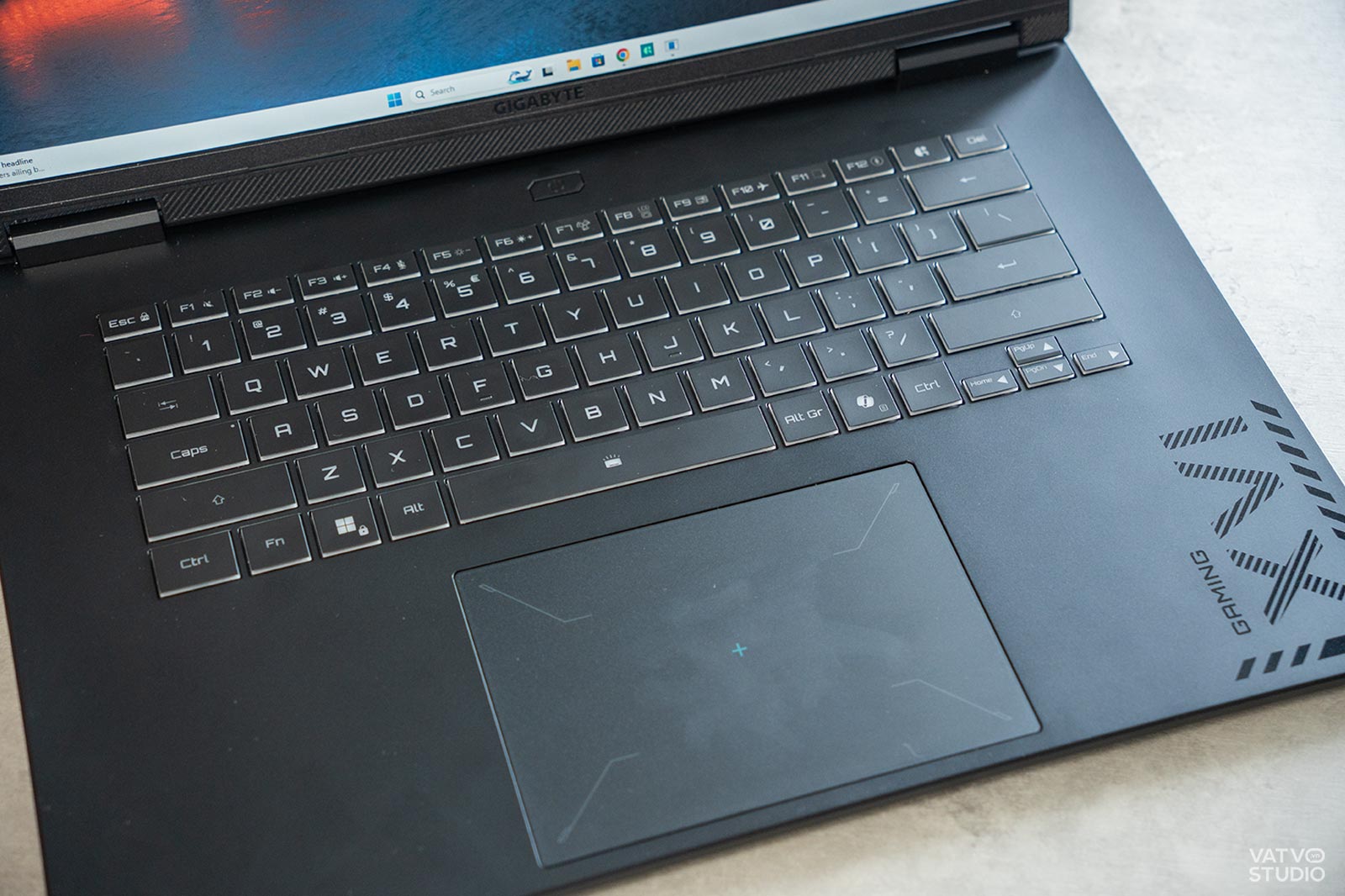 Ngoài ra, Gigabyte Gaming A16 đã loại bỏ cụm phím số, đưa bàn phím vào vị trí chính giữa, khắc phục hoàn toàn tình trạng lệch layout khó chịu trên các dòng sản phẩm cũ. Touchpad có kích thước rất lớn, bề mặt mịn và được đặt cân đối, mang lại trải nghiệm di chuột thoải mái.