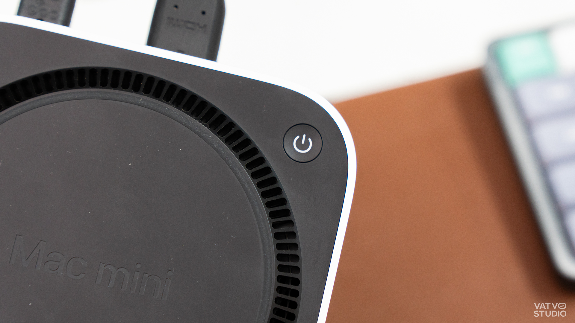 Trong khi đó, ở phía mặt dưới, Mac mini M4 Pro có các khe tản nhiệt cùng một nút nguồn đặt ở góc gây nhiều tranh cãi. Với mình, việc đặt nút nguồn ở vị trí này không ảnh hưởng nhiều tới trải nghiệm sử dụng vì khi làm việc trên các thiết bị chạy macOS, mình hiếm khi tắt nguồn.