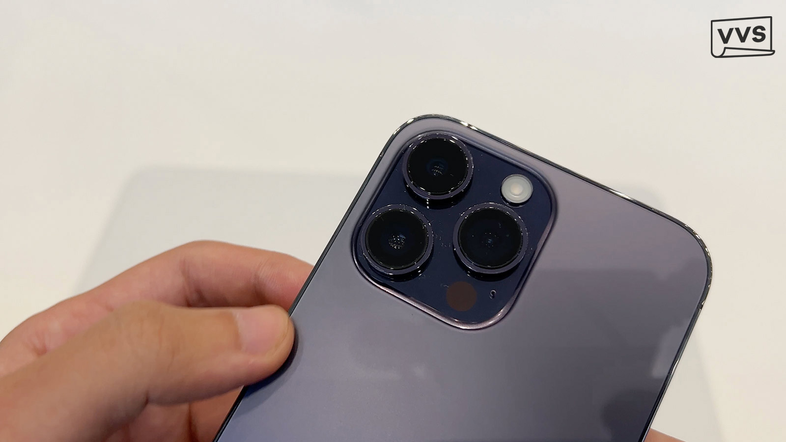Trở lại về thiết kế, có thể thấy iPhone 14 Pro Max không có quá nhiều khác biệt so với thế hệ tiền nhiệm 13 Pro Max. Mặt lưng máy vẫn được hoàn thiện từ kính nhám, logo Apple nổi bật ở chính giữa và cụm ba camera sau được đặt trong ô vuông nhô cao hơn so với mặt kính. Khung viền trên iPhone 14 Pro Max được hoàn thiện bởi chất liệu thép cao cấp, cạnh phải gồm phím nguồn và modem 5G, cạnh trái gồm cụm phím tăng giảm âm lượng và cần gạt rung và cạnh dưới gồm cổng sạc Lightning và loa ngoài.