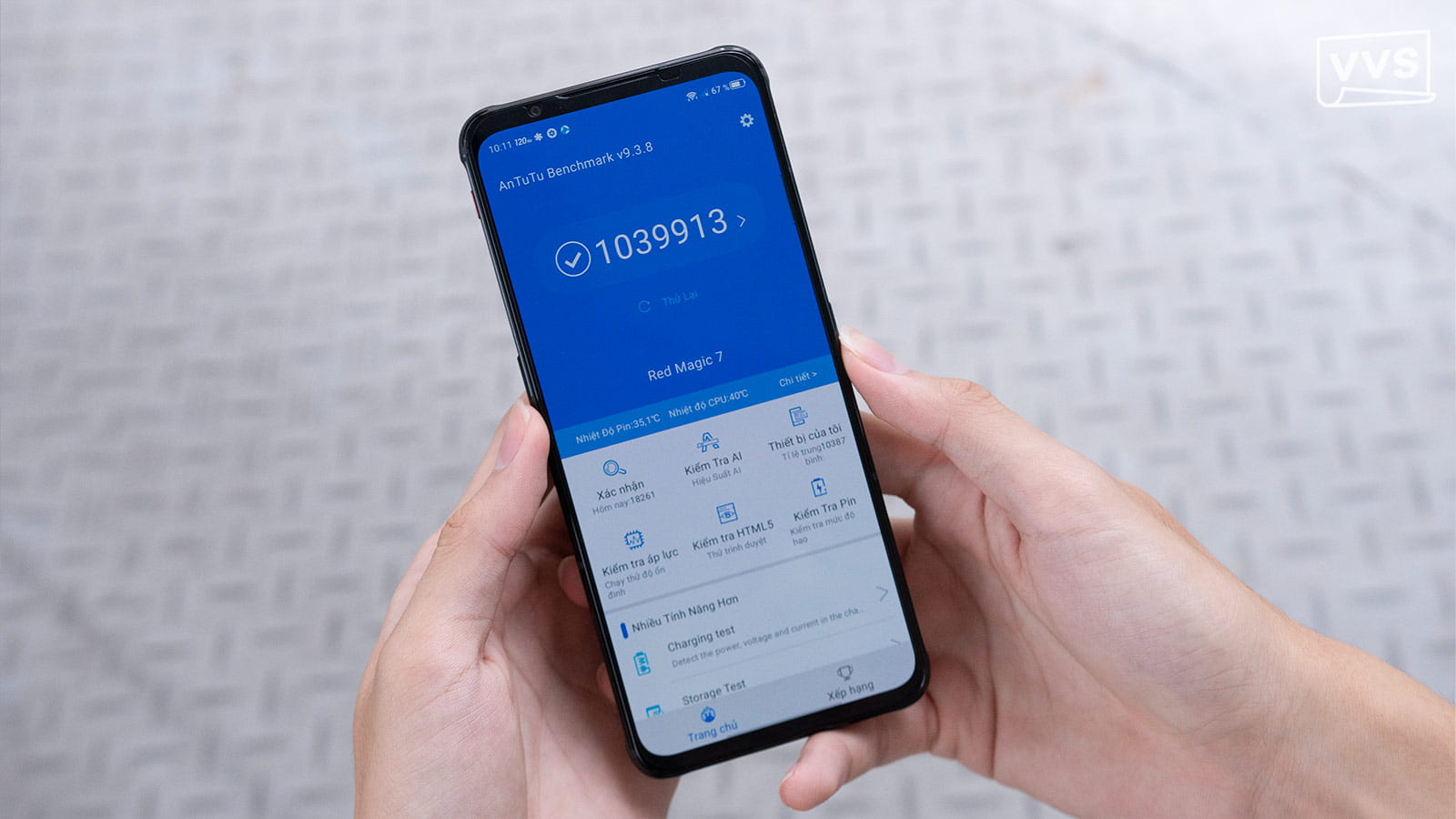 Với bộ vi xử lý Snapdragon 8 Gen 1 cùng 18GB RAM và 256GB ROM, Red Magic 7 đem lại trải nghiệm mượt mà bất kể nhu cầu từ cơ bản đến nâng cao. Khi chấm điểm Antutu trong điều kiện phòng mát, máy cho ra hơn 1.000.000 điểm cùng nhiệt độ chỉ khoảng 38 độ. Tương tự, với thử nghiệm 3DMark, độ ổn định mà máy đạt được cũng lên tới 89.1%. Đặc biệt, biểu đồ FPS chỉ giảm nhẹ theo thời gian, qua đó cho thấy khả năng kiểm soát sức mạnh cũng như nhiệt độ của máy với Snapdragon 8 Gen 1. Để làm được điều này, ZTE đã trang bị cho Red Magic 7 hệ thống tản nhiệt nhiều lớp bao gồm: quạt làm mát tích hợp bên trong máy, ống dẫn khí làm mát, lá đồng dẫn điện cao, vật liệu đất hiếm dẫn nhiệt, hệ thống làm mát buồng hơi (VC) và tấm than chì.