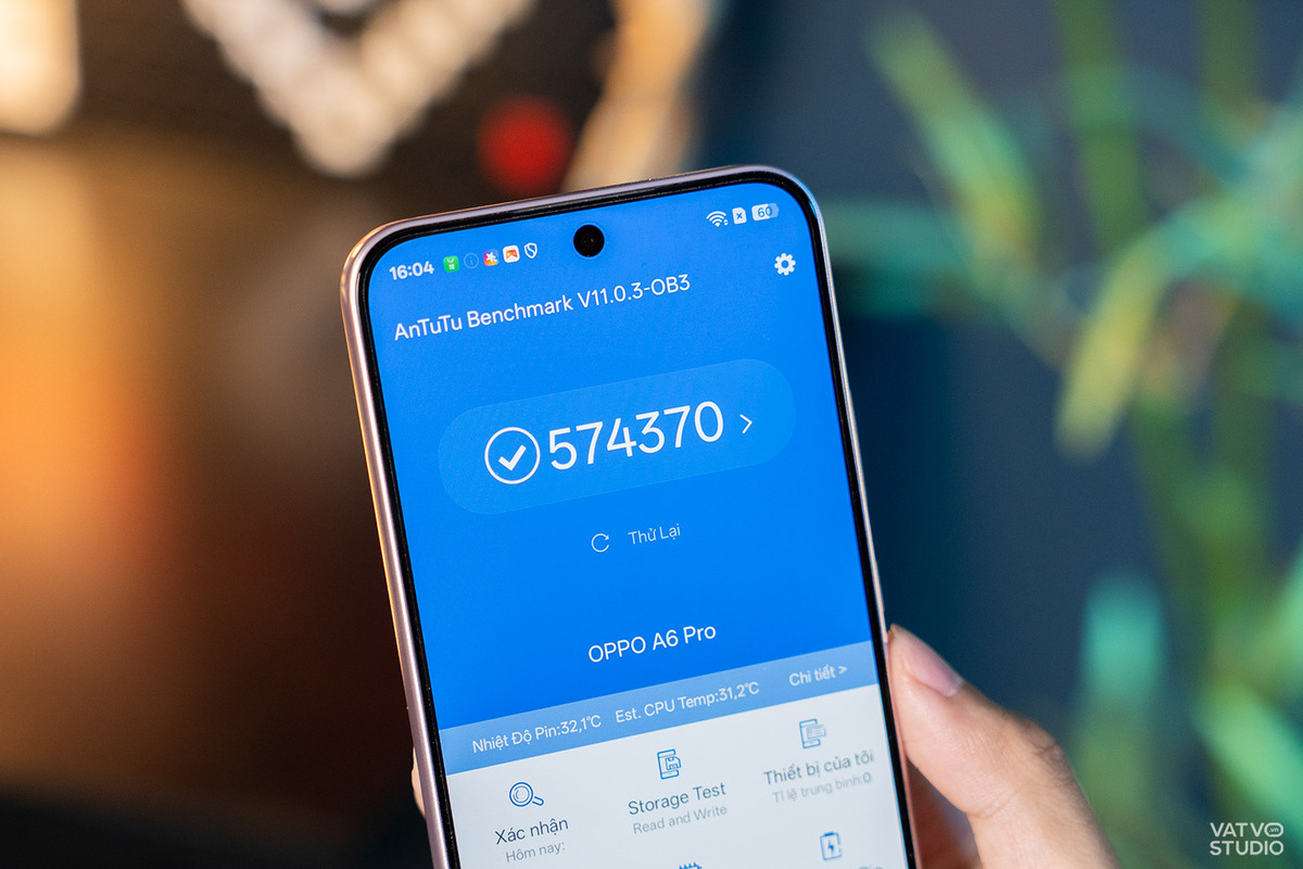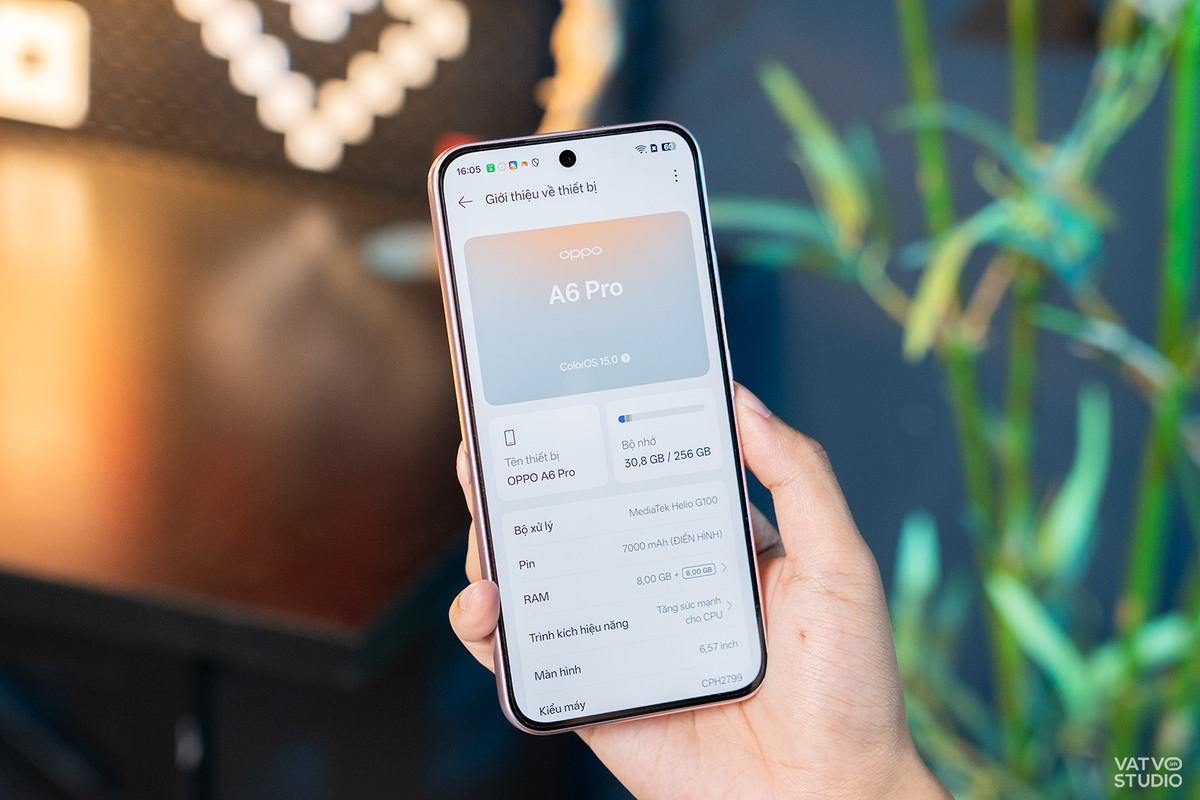 OPPO A6 Pro 4G được trang bị vi xử lý MediaTek Helio G100, đi cùng 8GB RAM LPDDR4X và bộ nhớ trong UFS 2.2 (128/256GB). Đây không phải là một con chip dành cho game thủ hạng nặng muốn đẩy thiết lập đồ họa cao nhất ở mọi tựa game, nhưng nó hoàn toàn đủ mạnh mẽ cho mọi tác vụ hàng ngày. Mình đã thử lướt web, xem phim, dùng các ứng dụng mạng xã hội và máy phản hồi rất nhanh hơn khá nhiều so với mẫu A5 Pro.