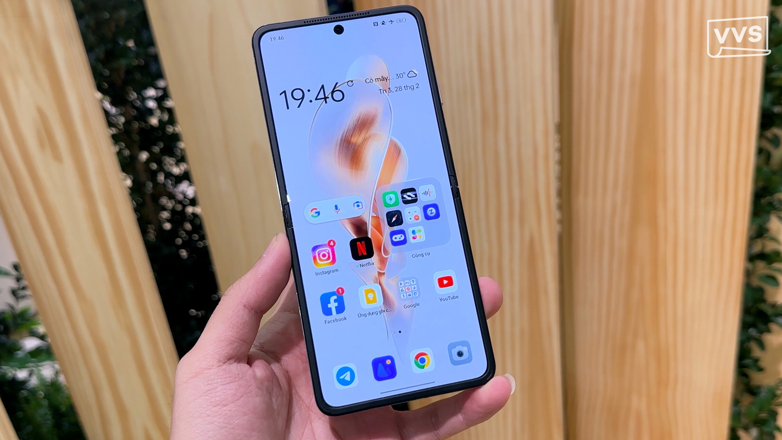 Lật sang mặt trước, chúng ta có một màn hình OLED lớn với kích thước 6,8 inch, tần số quét 120Hz và độ sáng tối đa đạt tới 1.600 nits. So với Galaxy Z Flip4, màn hình trên OPPO Find N2 Flip cho nếp gập mờ hơn trông thấy, độ khít giữa hai mặt màn hình cũng tốt hơn. Đánh đổi lại, máy không có bất cứ một tiêu chuẩn kháng nước / kháng bụi nào. Điều này rấy lên những sự hoài nghi về độ bền trên Find N2 Flip, khi mà bất cứ một giọt nước, cát hay bụi bẩn nào đọng lại đều có thể gây ra ảnh hưởng xấu đối với nếp gập.