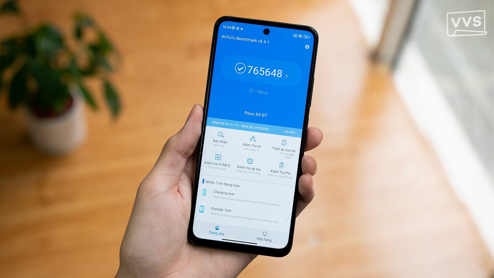 Điểm nhấn của của mẫu máy náy là ở cấu hình khi nó sở hữu Dimensity 8100. Xét về hiệu năng, con chip tới từ Mediatek sẽ cho sức mạnh tương đương với Snapdragon 870. Trong bài Benchmark với phần mềm Antutu, máy cho ra 765.648 điểm đồng thời ghi nhận mức nhiệt độ thấp, không bị tăng nhiệt quá nhiều trong suốt quá trình chấm điểm. Với Geekbench 5, POCO X4 GT cho ra 916 điểm đơn nhân và 3675 điểm đa nhân.
