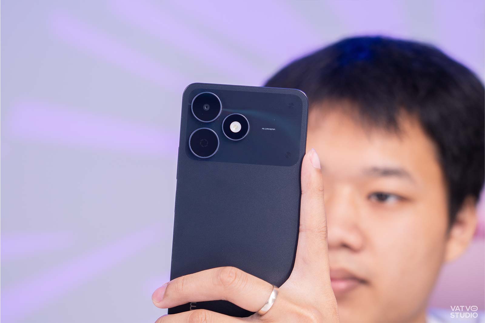 Mặt lưng của phiên bản mình đang cầm có màu Đen Cuồng Phong với hiệu ứng nhám mịn, giúp hạn chế bám mồ hôi và dấu vân tay rất hiệu quả. Đặc biệt, cụm camera sau của máy được sắp xếp theo dạng tam giác cân xứng, gợi liên tưởng đến ngôn ngữ thiết kế trên iPhone 17 Pro Max. Ngoài ra, máy còn có tùy chọn màu Xanh Băng Ngọc với sắc thái trẻ trung, rất phù hợp với gu thẩm mỹ của các bạn trẻ hiện nay.