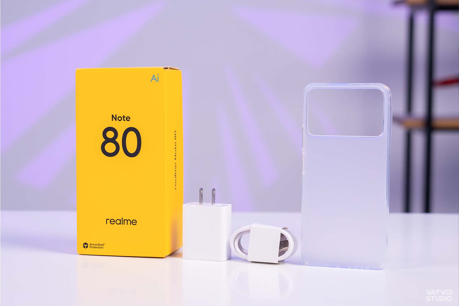 Bên trong hộp, realme tặng kèm bộ phụ kiện rất đầy đủ bao gồm: củ sạc nhanh 15W, dây sạc USB-C, que lấy SIM và một ốp lưng dẻo bảo vệ máy. Về phần mềm, máy được cài sẵn giao diện realme UI dựa trên nền tảng Android 15 ngay khi xuất xưởng.