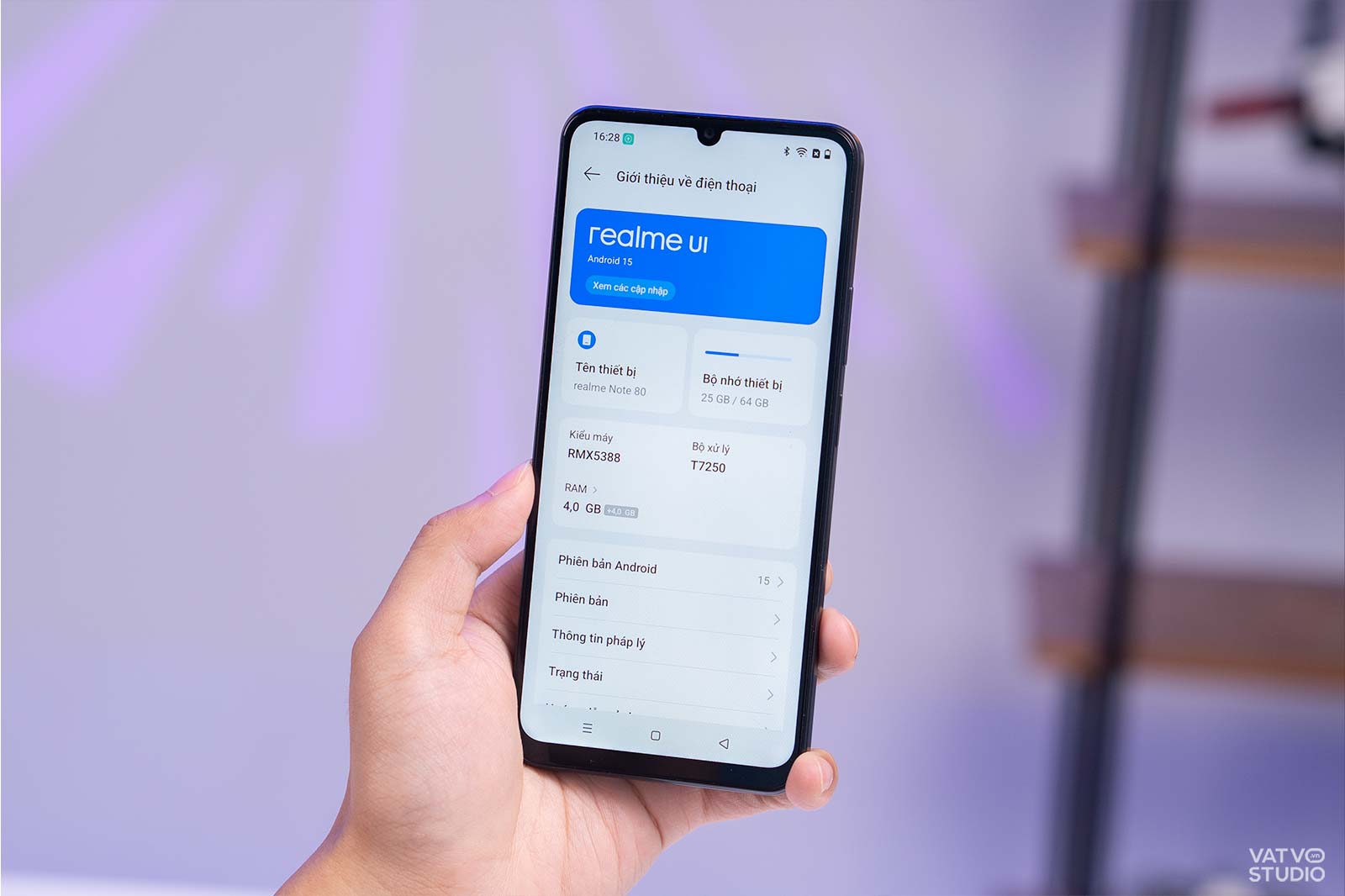 Do độ sáng tối đa của màn hình chỉ dừng ở mức 563 nits nên mình gặp khá nhiều khó khăn khi xem các nội dung trên realme Note 80 ở ngoài trời nắng hay các môi trường ánh sáng mạnh. Ngoài ra, việc máy vẫn duy trì thiết kế camera selfie dạng “giọt nước” khiến mặt trước của thiết bị trông chưa thực sự hiện đại.