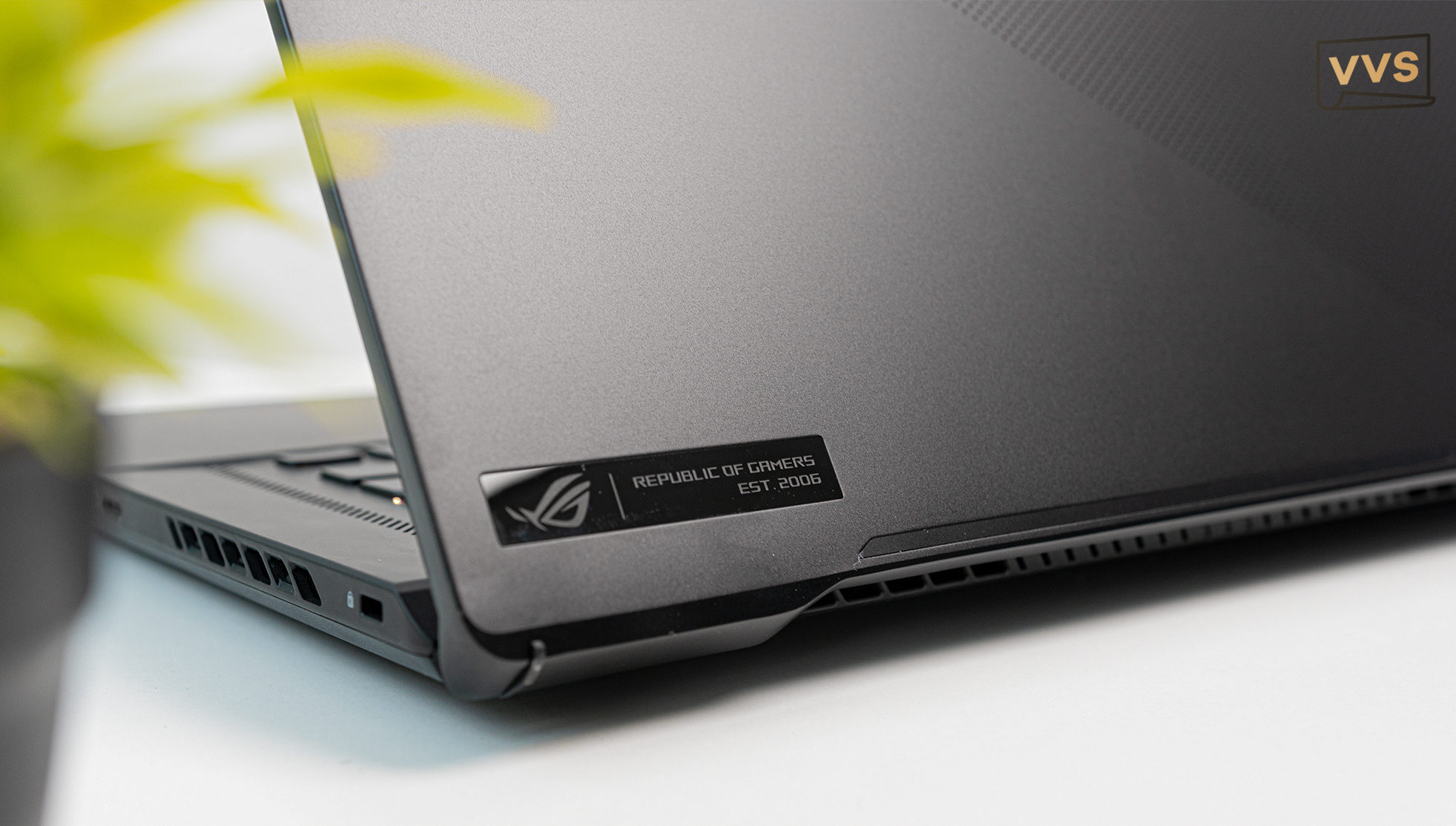 Phía cạnh dưới bên trái vẫn là một dải chữ nhật nhỏ có LOGO và tên thương hiệu ROG. Xét về tổng thể, mặt lưng này vẫn đơn giản nhưng không hề lẫn với bất kỳ mẫu laptop nào khác trên thị trường. Theo ASUS, mặt lưng của máy sử dụng thiết kế Dot Matrix cùng lớp film Prismatic – đã từng xuất hiện trên Zephyrus G-Series năm nay.
