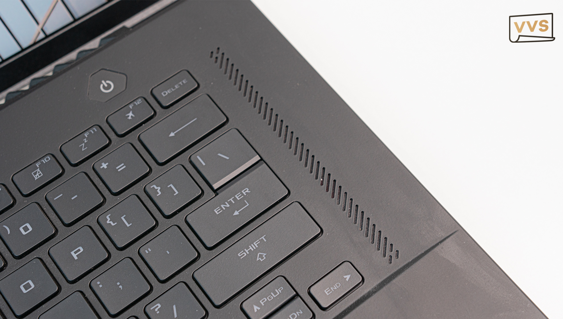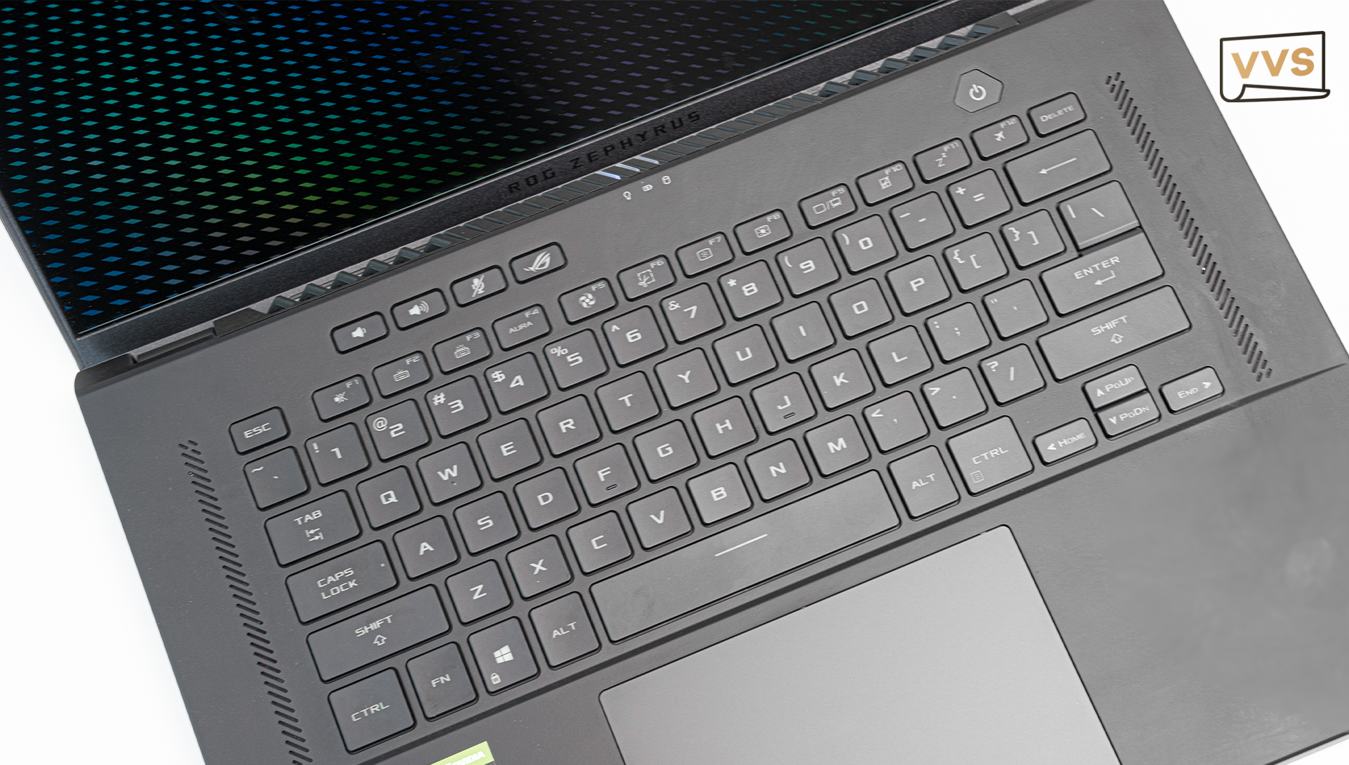 Phía trên sẽ là một layout bàn phím quen thuộc của dòng Zephyrus. Hành trình phím tương đối ổn, cùng với lớp phủ hoàn toàn tương tự với TouchPad. Hai bên sẽ là dải loa gồm 6 loa trang bị Dolby Atmos. Ngoài ra, ROG cũng đã đem webcam trở lại với dòng máy, cùng hệ thống micro khử ồn bằng AI để phục vụ đàm thoại.