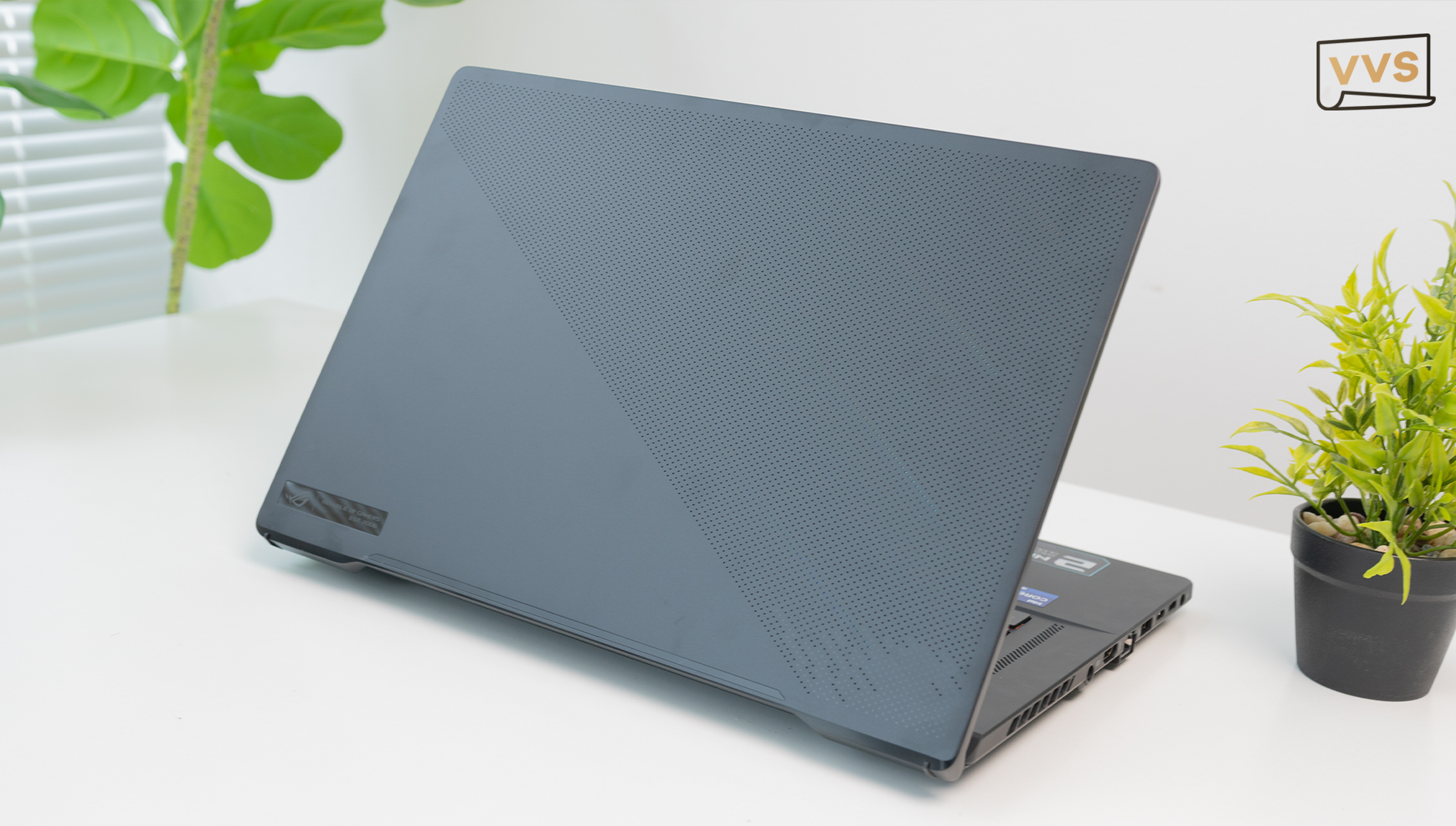 Ngay lần đầu cầm Zephyrus M16 trên tay, mình đã không quá bất ngờ bởi chất liệu mặt lưng. Nó vẫn là nhựa nhám, trong đó có một nửa được điểm những lỗ nhỏ tạo nên hoạt tiết đặc trưng của dòng Zephyrus.