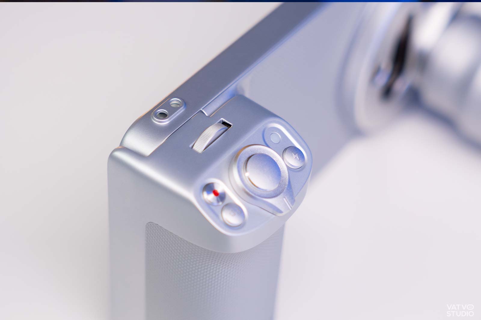 Điểm nhấn tiếp theo là phần báng cầm tay, đóng vai trò cốt lõi trong trải nghiệm thao tác. Báng cầm này tích hợp sẵn một viên pin dự phòng, giúp cung cấp thêm thời gian hoạt động. Trên báng cầm, hãng trang bị các phím bấm vật lý như vòng xoay zoom, nút chụp ảnh, nút quay phim, phím chức năng FN và công tắc đèn flash, mang lại cảm giác sử dụng chân thực.