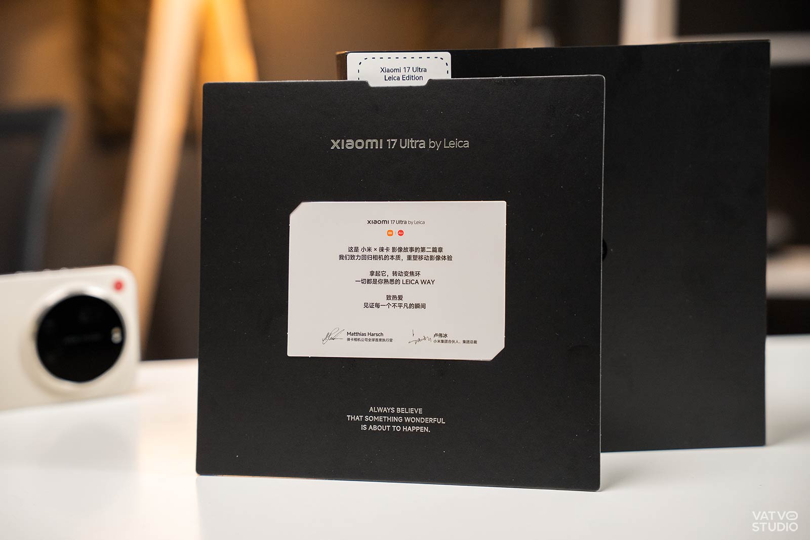 Ngay từ hộp phụ kiện của sản phẩm, Xiaomi 17 Ultra đã thể hiện sự chỉn chu, đầu tư của hãng. Hộp máy được thiết kế bắt mắt, nổi bật với dòng chữ ký của cả Matthias Harsch, CEO của Leica Camera.