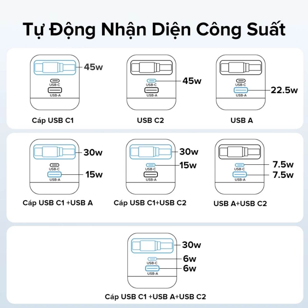 Lưu ý: Khi sử dụng nhiều cổng, công suất có thể chỉ đạt khoảng 15W