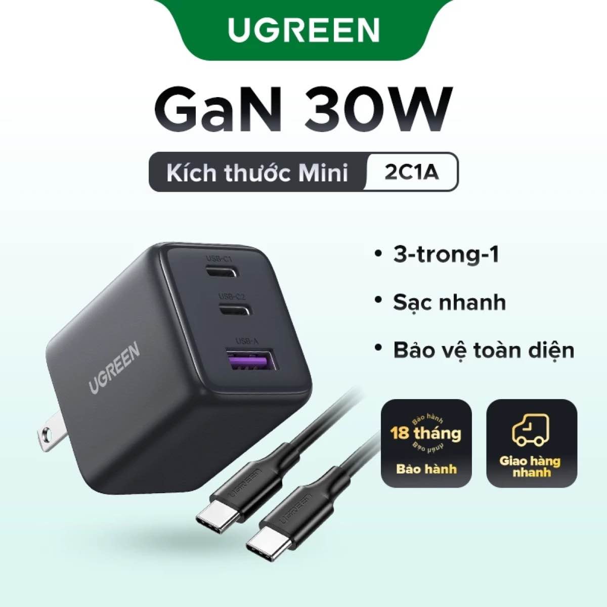 Sạc UGREEN 30W Nexode GaN (3 cổng)