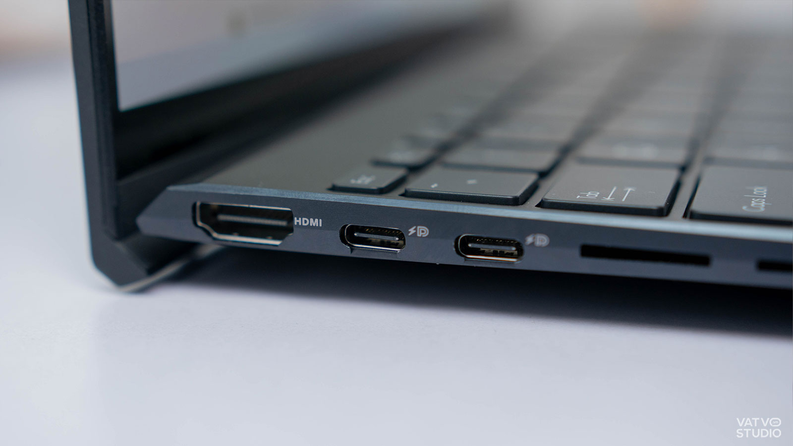 Lật sang cạnh máy, MacBook chỉ hỗ trợ 2 cổng USB-C và jack tai nghe 3.5mm. Đây sẽ là thiếu sót lớn nếu bạn thường xuyên làm thuyết trình hay chuyển ảnh, dữ liệu từ thẻ nhớ. Trong khi đó, khả năng kết nối trên ASUS Zenbook 14X OLED đa dạng hơn nhiều với 2 cổng USB-C, một cổng USB-A, một cổng HDMI và một jack 3.5mm.