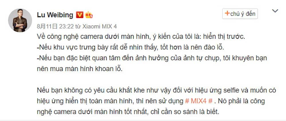 Vị quan chức cấp cao này của Xiaomi cũng nói rằng: nếu họ để khu vực hiển thị của camera selfie dễ nhìn thấy hơn thì tốt nhất là bạn nên sử dụng camera “đục lỗ” truyền thống. Công ty cũng đảm bảo đã làm hết sức mình và công nghệ camera dưới màn hình của hãng đang được nhanh chóng cải thiện. Có thể thấy với Mi Mix 4, Xiaomi đã chấp nhận đánh đổi chất lượng camera selfie để lấy một màn hình full view không bị khiếm khuyết. Hiện tại, công nghệ camera selfie ẩn dưới màn hình không còn quá mới mẻ trong thời điểm hiện tại, nhưng để hoàn thiện nó thì vẫn còn là cả một quá trình.