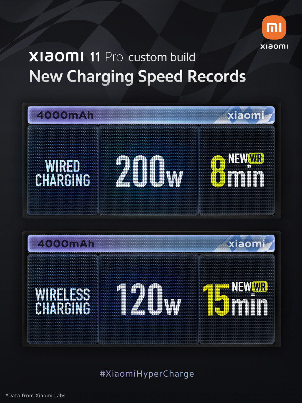 Vào tháng 5 vừa rồi, Xiaomi đã giới thiệu công nghệ sạc nhanh 200W trên chiếc Xiaomi Mi 11 Pro phiên bản tùy chỉnh. Thiết bị có pin 4000mAh và chỉ mất 3 phút để sạc 50% đầu tiên và 8 phút để sạc đầy 100%. Đồng thời, công nghệ Hypercharge mới cũng sẽ hỗ trợ sạc không dây cực nhanh 120W, nó có thể sạc đầy viên pin 4000mAh trong vòng 15 phút sạc mà thôi.