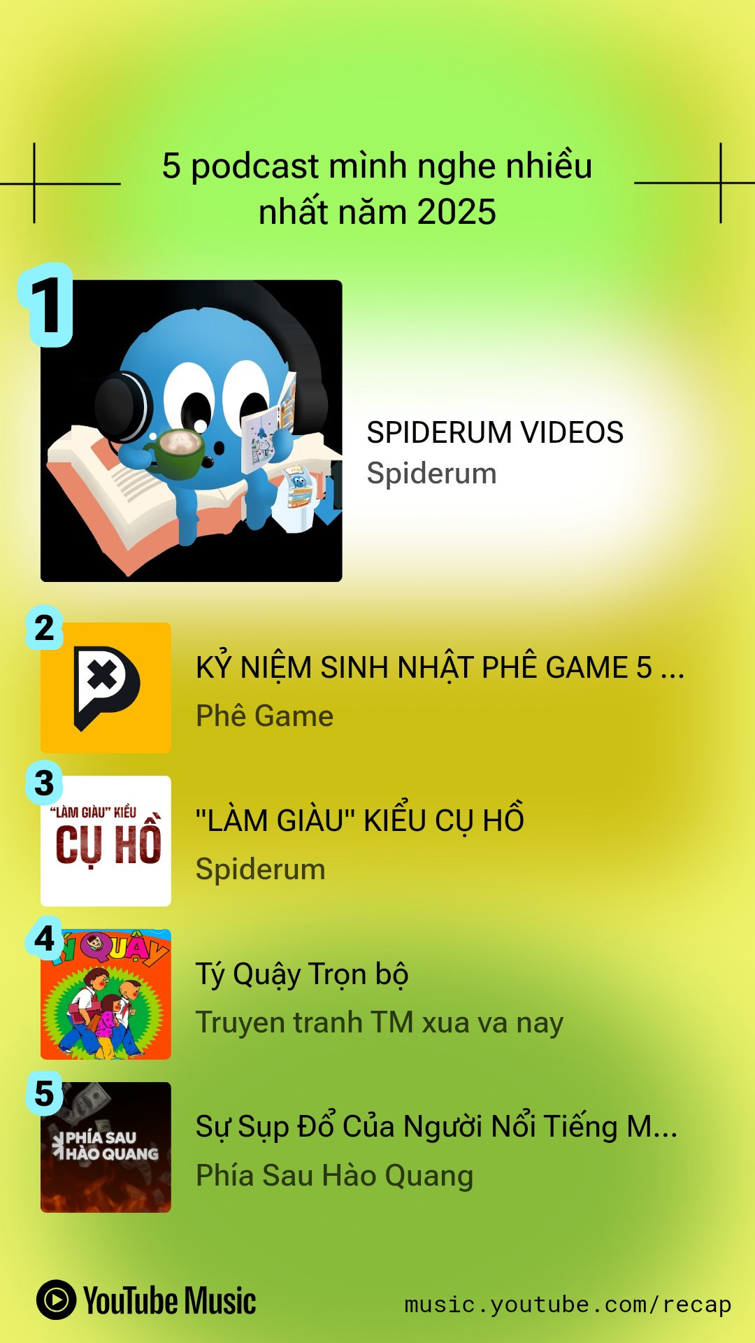 Tuy nhiên, bên cạnh những thống kê chính xác, YouTube Music vẫn làm mình thấy khó hiểu ở phần phân loại Podcast. Trong danh sách “5 podcast mình nghe nhiều nhất năm 2025”, bên cạnh những cái tên như Spiderum hay Phía Sau Hào Quang, thì vị trí số 4 lại là “Tý Quậy Trọn bộ”.